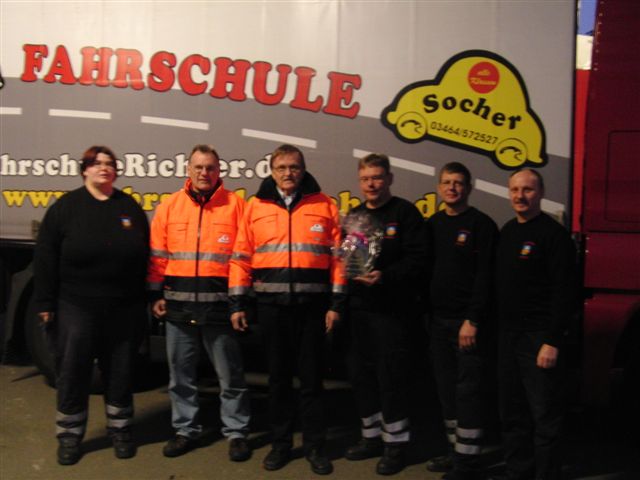 Die Feuerwehr Freiheit ist voller Vorfreude auf ihr neues Löschgruppenfahrzeug und die Vorbereitungen für die Inbetriebnahme im Frühjahr 2012 laufen auf Hochtouren. Neben den erforderlichen Umbaumaßnahmen der Fahrzeughalle sind auch personelle Weiterbildungen von Nöten. Da das neue Fahrzeug ein Gesamtgewicht von über 7,5 Tonnen aufweisen wird, können es die Kameraden mit altem Klasse-3-Führerschein nicht mehr fahren. Nur die bisher wenigen Besitzer des alten Klasse-2-Führerscheins oder des neuen Klasse-C-Führerscheins dürfen das Fahrzeug noch bewegen. Um die Einsatzbereitschaft auch künftig gewährleisten zu können, drückten daher die Kameraden Thomas Domeyer, Joyce Spillner, Axel Kruschwitz, Frank Wenzel und Florian Klinge bei der „Fahrschule Richter“ die Schulbank und begaben sich hinter das Lenkrad des Fahrschul-Lkw. Nachdem nun nur noch bei einem Kamerad die praktische Prüfung aussteht, bedankten sich die Fahrschüler mit einem kleinen Präsent bei ihrem Fahrlehrer Jens Wilke für die gute Ausbildung. Die Feuerwehr Freiheit gratuliert zur bestandenen Prüfung und wünscht allzeit gute Fahrt!